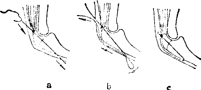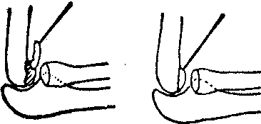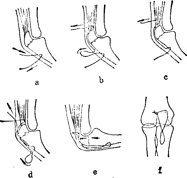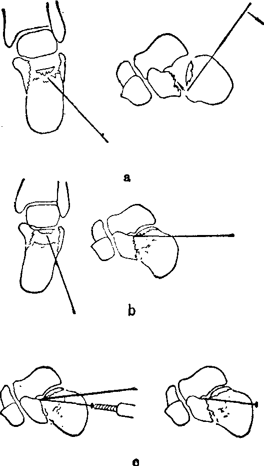 跟骨丘部骨折撬拨复位 a. 经皮撬拨半月形塌陷骨折片。钢针前端应略超出此骨折片的前端 b. 完成撬拨复位 c. 钢针保持骨折复位,用一特制钢钉作经皮内固定,冲头将钢钉击入。完成内固定后,拔除冲头和撬拨复位的钢针尺骨鹰嘴骨折肘部略屈曲位,可作钢丝经皮缝合法复位固定。缝合法有两针孔缝合法(见前页)及四针孔缝合法两种。操作时,肘呈微屈位,用直针由骨折远端尺侧穿入,横向穿过尺骨背部,于桡侧穿出皮肤。钢丝两端改用弯针连带,各由原针孔穿入,沿鹰嘴背侧皮下,呈交叉状分别在鹰嘴顶点两侧穿出皮肤。再将鹰嘴内侧钢丝穿回皮下,沿鹰嘴顶点骨面,向外穿过肱三头肌腱,与鹰嘴外侧钢丝汇合,收紧结扎形成“8”字形钢丝内固定。最后屈肘至90°位,使钢丝对抗肱三头肌牵拉张力,在两骨断端之间形成压缩力。