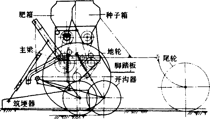图2 平畦筑埂播种施肥联合作业机示意图 平畦筑埂器有两种形式:人字形和倒八字形。人字形平畦筑埂器,安装于机架主梁和开沟器梁上,其左、右刮土板在前端合在一起。工作时,开沟器前方种床的表层干土与土块被刮土板推移至两侧,形成平整的畦面,该畦两侧土壤与相邻畦的两侧土壤共同形成畦埂,以利于分畦灌溉,使浇水均匀,节省用水。连接刮土板的前支杆和弹簧压杆的长度可调节,以改变刮土板前后入土深度,使畦面平整,埂形丰满。倒八字形平畦筑埂器所筑的畦埂位于播种机播幅中位,畦埂一次成形,畦面不易平整。 播种联合作业机具经济效益较高,但由于机组庞大,结构较复杂,技术要求较高,需较大功率拖拉机牵引,因此,其使用推广受到一定限制。随着大功率拖拉机的生产使用日益增多,新技术的应用,以及农业机械化的不断发展,将会需要更多的新型的播种联合作业机具,其联合作业项目将会更合理,机具结构应既能进行多项联合作业又能分段单项作业,以满足不同的使用要求。 |