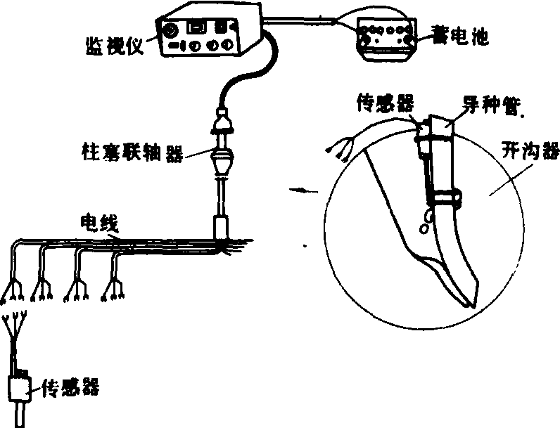 播种监视器 1.传感器 2. 电线 3. 柱塞联轴器 4. 监视仪 5. 蓄电池 6.导种管 7. 开沟器 |