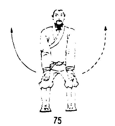 | 释义 | 擒捉伏兔 擒捉伏兔四十九式经络动功第1段“通经”动作之七:随着呼气(聚呼),松腹松肛,脚跟迅速震地,两腿半蹲;同时两腕放松向前,向下弧形抽打膝上6寸起肉处的伏兔穴;眼平视前方。(图75)练功次数:叶底藏花和擒捉伏兔二式连在一起各做3次。要点:重心尽量高提;吸气时细匀深长,呼气时轻吐“呬”音;两掌抽打伏兔穴要富有弹性,快速而准确。下接动作之八——怀中抱月,动作之九——商商相接。