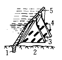 图1 平板坝 1. 齿墙 2. 岩石 3. 支墩 4. 加劲梁 5.平面挡水板