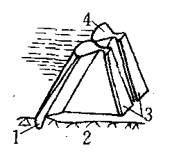 图3 大头坝 1. 齿墙 2. 岩石 3. 支墩 4. 大头挡水面板 支墩坝由一系列的支墩和挡水盖板组成的坝。支墩顺坝轴线排列,前面设挡水盖板,遮断河谷,形成挡水面。上游水压力由挡水盖板传给支墩,再由支墩传递到地基。支墩坝一般用混凝土和钢筋混凝土材料建造。主要类型有平板坝、大头坝及连拱坝等。 支墩坝buttress dam |