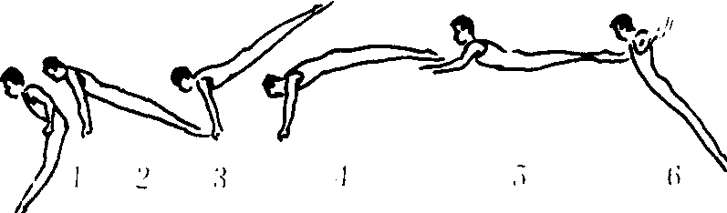 支撑后摆挺身下 支撑后摆挺身下支撑向后摆动,并向侧越杠挺身跳下的动作。动作要领:支撑后摆,当身体后摆过杠下垂直部位后,做直臂顶肩推杠和两腿加速向后上方摆动动作,后摆超过肩水平部位时,身体向左移出杠外,迅速地顶肩推手换握,保持挺身姿势落地。保护与帮助:杠两侧分别站人,一手握其上臂,一手托腹帮助出杠。教学重点: ❶正确自如地支撑摆动动作是支撑后摆挺身下的基础; ❷先在杠端练习该动作,体会后摆侧移重心和顶肩推手换握动作,然后在杠中在助力下完成支撑后摆挺身下。