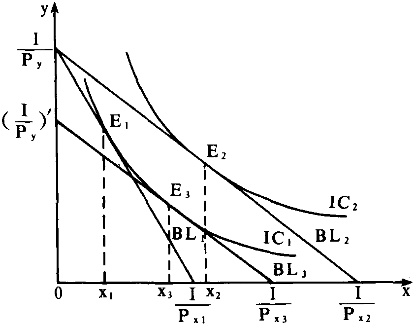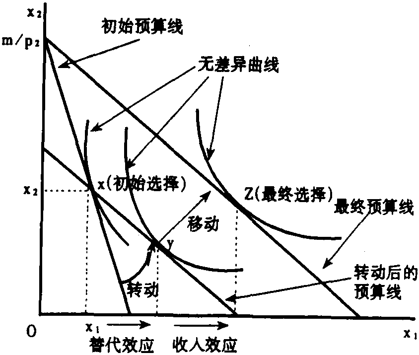 Ejm=-(Ej1+Ej2+…+Ejj+…+Ejn) (2) 推导过程如下,(1)式可表示为:Eji=εji-αiEjm (3) 式中:αi=pixi/m,即对商品i的消费支出占总支出的份额;εij是补偿的需求价格弹性。(3)式的两端对i求和,并利用εj1+εj2+…+εjn=0 〖参〗替代效应 ☚ 替代效应 价格效应 ☛ 收入效应 收入效应income effect指消费者实际收入的变化对商品需求量的影响。它与替代效应一起,可以解释消费品价格变化而引起的需求量的变化。若消费品X的价格下降,消费者的实际购买力将提高,则: ☚ 普通需求函数 替代效应 ☛ |