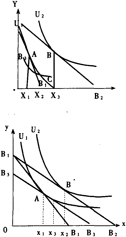 收入效应Income Effects收入效应是价格变化后的效应之一:当X商品的价格上升(下降)时,购买同等量的X商品需要更多(更少)的收入,即价格的上升(下降)使消费者拥有更少(更多)的实际收入。假定消费者购买两种商品X和Y,预算线B1B1与无差异曲线U1相切于A,由于X商品的价格下降,预算线由B1B1变为B1B2,与无差异曲线U2相切于B,使X和Y的购买量都发生变化,以X商品来衡量,从X1到X2,是价格变化的总效应,它可以分解为两个部分,一部分是替代效应,一部分是收入效应,替代效应指假设实际收入保持不变,即消费者的效用保持不变时消费者购买X商品数量的变化,在图中表现为X3-X1,这时用到了补偿预算线B3B3,它与B1B2平行,与无差异曲线U1相切于C点;同时收入效应就是价格变化的总效应减去替代效应,即X2-X3。这是希克斯关于收入效应的定义,也是最常用的关于收入效应的定义。