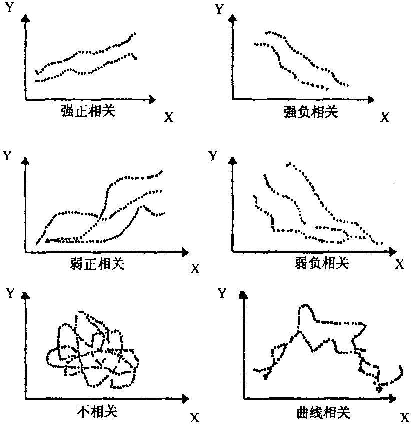 | 释义 | 散布图[参]相关图 散布图scatter diagram在研究两变量的相关关系时,通常把n对样本观察值(xi,yi),i=1,2,…,n作为n个坐标点描在直角坐标平面XOY上,这种图称为散布图。通过观察散布图上各点的分布,可以直观地初步判断两变量的关系及密切程度。如果n个点近似为一条直线,则两变量间有强的直线相关关系,如果n个点近似为某种曲线,则两变量间有相应的曲线相关关系 (见下图)。散布图通常也应用于回归分析中,由散布图的开头可初步判断应选用何种回归函数。