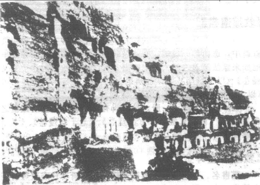 敦煌千佛洞 (局部) 甘肅敦煌東南二十公里有鳴沙山,其麓有三界寺,寺旁掘有石窟四百九十二處,舊名“莫高窟”,又稱“敦煌石室”。此為印度式石窟寺院,初建於六朝前秦建元二年(366),以迄元代,凡歷十世纪。其間不斷掘鑿造像、繪製,計有壁畫四萬五千多平方米、彩塑像二千一百餘尊 (其中北魏二十三尊、隋九十六尊、唐二百一十三尊),誠為佛教美術之寶庫、世界文明一史迹。 清·光绪庚子(1900),道士掃除積沙,於復壁破處見藏經室,存書甚富,皆唐及五代人手寫,并有雕本,佛經尤夥。此密室乃昔人避五季、宋代戰亂而建,長時未為世知。光緒丁未 (1907),英人斯坦因、翌年法人伯希和等先後至其地,掠奪古寫本、古經卷等精品一萬餘件而去,分别藏入其國博物館。爾後,日本大谷探查隊亦至此,竊走珍貴文物累累,藏入日本中村氏書道博物館、西本藏寺大谷家。石室古寫本、古經卷已經整理印行者有《敦煌遗書》、《敦煌石室遺書》、《敦煌石室碎金》、《鳴沙石室古佚書》等。建國後,敦煌千佛洞列為重點保護單位。 |