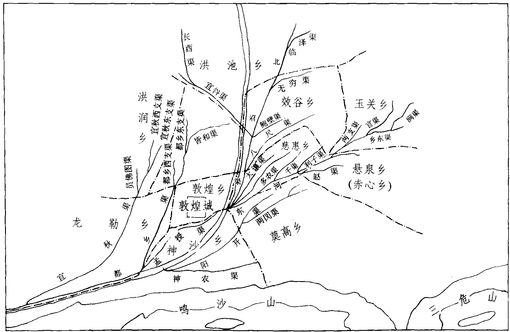 唐宋时期敦煌城绿洲诸乡位置及渠系示意图