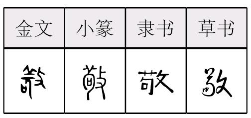 jìnɡ形声,从攴,茍(jì)声,隶定为“敬”,攴改为攵。(一说表意,从攴从茍,攴为击,茍有自我约束、审慎义。)本义为谨慎、严肃,引申为尊重、谦恭而有礼貌、有礼貌地对待或送上等。 【辨析】 ❶以“敬”作音符构成的形声字一般韵母为inɡ,但声调和声母不同。jǐnɡ:警、儆∣qínɡ:擎、檠。 ❷敬/恭 见128页“恭”。 ❸在台湾,“敬”的左上角4画,不是艹。敬 (jìng)从攴、茍。 【按】敬,《説文》:“肅也。”段玉裁注:“肅者持事振敬也。” 敬 金 篆 隶jìng【析形】会意字。古文字形从攴,从苟。苟有审慎之意。 【释义】《说文》:“肃也。”本义指恭敬,端肃。[敬而远之]表示尊敬却有所顾虑不愿接近。作动词用,又表示有礼貌地送上去,如[敬酒]、[敬茶]。 恭、敬在表示敬重有礼的意义上是同义词。文献中常对举或连用。“恭在貌,敬在心。宾客轻,故主恭,祭祀重,故主敬。”[肃然起敬]、[敬而远之]、[敬畏]都指内心活动,[谦恭]、[玩世不恭]侧重仪态行为。 【shape analysis】 It is the associative character.The meaningful parts are攴(pū)and 苟(gǒu)which means cautious. 【original meaning】 Respect. 敬 *敬kieng[甲骨] [金文] [小篆] 《說文》: , 肅也。 从攴、苟。苟,自急敕也。(九篇上) 手持杖刑問一人以儆戒之? ☚ 解 辟 ☛ 敬〈副〉“敬意”的省辞。特意;特地。 《金》七: 薛嫂先入去通报姑娘得知,说:“近边一个财主,~来门外和大娘子说亲。”又六二: 谢子纯听见嫂子不好,唬了一跳,~来问安。 《醒》八四: 我要不是自己~来接你,我就从京里上任,近着好些路哩。 《聊·墙》二: 原是来问问安,也不是~要钱,何妨出来同相见?又 《寒》二: 老天爷待为咱~生出一个包文正来哩么? |