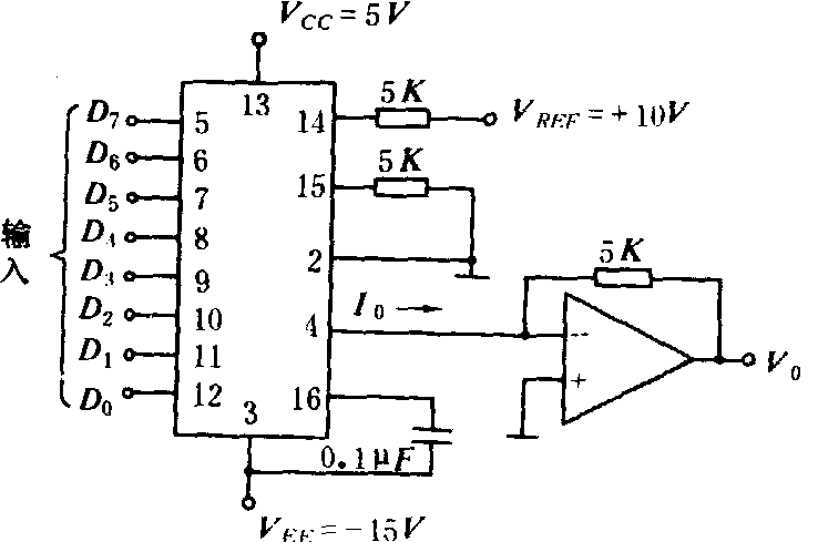 DAC0808转换器的连接电路 指标 数/模转换器的主要指标为:❶分辨率,指转移器所能分辨的被测量的最小值。如10位转换器的分辨率为1/210=1/1024; ❷稳定时间,指转换器的输入量快速改变时,其输出电压稳定下来所需要的时间。其他技术指标与模/数转换器类似(见模/数转换器)。 常用的数/模转换器有:8位数/模转换器AD1408、DAC080、DAC0832、DACIC8B; 10位数/模转换器AD7520、AD7533、AD561J、5G7520;12位数/模转换器AD7521、AD7543、DAC-68IC、AD 566 J;16/18位数/模转换器DAC1136、DAC1138。 |