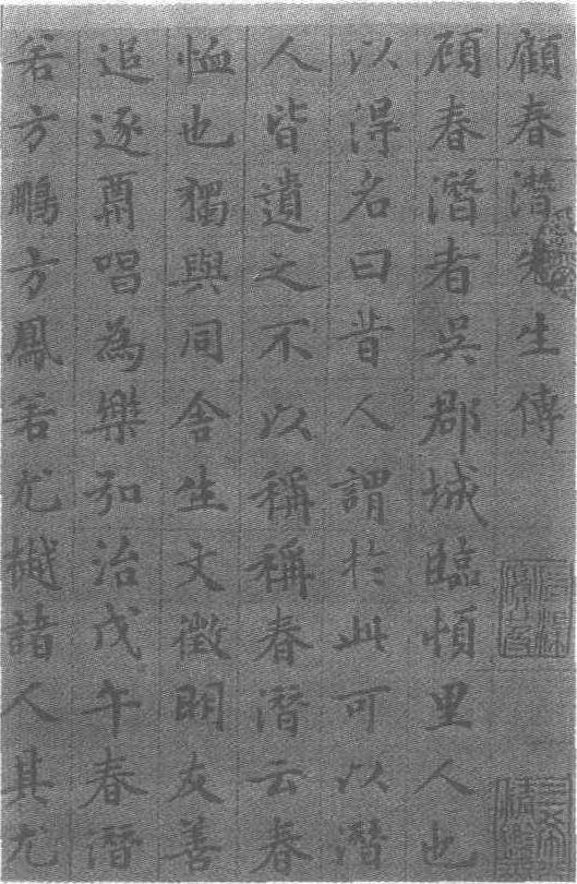 明。纸本。纵118.8厘米,横49.7厘米。上海博物馆藏。文徵明(见《文徵明行草书西苑诗卷》条目)书。此轴首尾计1000余字,写于嘉靖二十一年(即公元1542年),文氏时年73岁高龄。是晚年归田后作品。楷书齐整地写于鸟丝格内,采用“纵有行,横有列”的布局,结体方正宽博平稳,既有晋人古雅舒和的气韵,又融入了赵孟頫姿媚秀丽的特点,给以整体严谨,局部活泼灵动的感觉,通篇气息畅通,浑成一体,毫无板滞之感,堪称文氏的代表作。