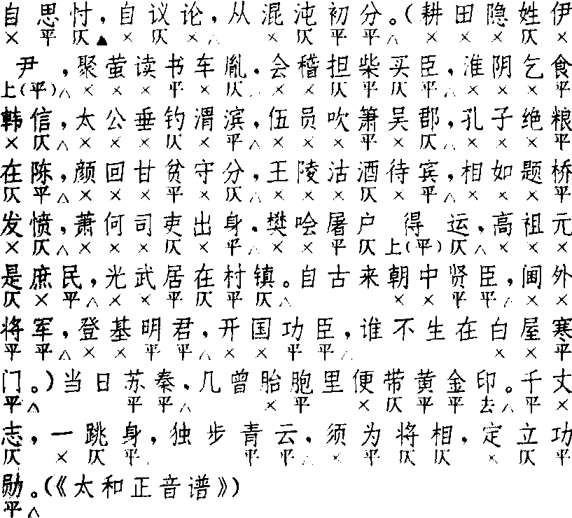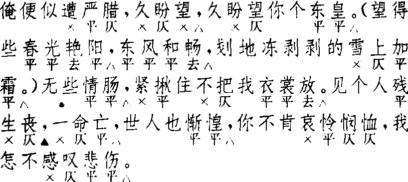 斗虾蟆 斗虾蟆关汉卿 《拜月亭》  其二 高文秀 《谒鲁肃》  全曲十句:3 ▲,3 △,4 △。2 △,7 △。3,3 △,2 △,4,4 △。例须增句。现存元人作品,未见不增句者。增句在第三句下,增四字句最简;常见的是先增六字句后再增四字句,如关汉卿《窦娥冤》增六字句二十二句又增四字句二句,《蝴蝶梦》增六字句十六句又增四字句四句。杨景贤《西游记》增六字句与四字句之间,又增三字句二句,较少见。增句须句句叶韵,六字句须双数,偶句多叶仄韵,四字句最后 一句须叶平韵。亦有减第八句二字句者,如关汉卿《窦娥冤》、朱凯《黄鹤楼》。一名〔絮虾蟆〕、〔虾蟆序〕。《太和正音谱》正名用〔草池春〕,盖取宋人诗“春草池塘处处蛙”之意。 ☚ 贺新郎 哭皇天 ☛ 00007423 |