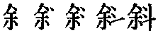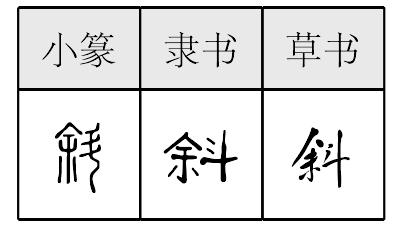【提示】余,位于字左时,第二笔捺改成点; 第六笔宋体是撇,楷体是点。 *斜xié11画 斗部 (1) 不正;偏侧: ~面|歪~|倾~|~着放。 (2) 向偏侧方向移动: 太阳西~。 斜 ☚ 斟 升 ☛ 斜xié小篆形声字。从斗,余声。声母演变如余徐、羊详祥、易锡例,韵变如卸御、且蛆,又略如屈掘例。本是用斗(量具)舀出,倾出义。用工具舀出东西,必倾斜着用,故引申为不正,偏侧。如:斜坡|纸裁斜了|他家和我家斜对过(或说“斜对面”)。 斜★常◎常