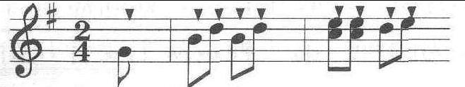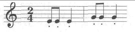 指用以表示前后音断开的符号。根据断音的不同程度可分为三种(1)断奏或跳音,表示演奏时,其音时值约占原来音符时值的一半; 标记为符头一方的小圆点。(2)特断音或特顿音,表示演奏时,其音时值约占原来音符时值的四分之一,标记为符头一方的锥形小三角。(3)连断音或半顿音,表示演奏时,其音时值约占原来时值的四分之三,标记为符头一方的小圆点加连线。例:跳音:特顿间:连断音: