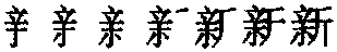 新 甲骨文; 金文; 篆xīn[辛(聲符) +斤(刀斧。意符,甲骨文像用手〈又〉執斤,做砍伐姿勢。後手被簡化)+木(金文後加,意符)→新(《説文》:“新,取木也。從斤, 聲。” 段玉裁給予糾正:“當作從斤、木,辛聲。非從斤, 聲也。”新,甲骨文像以手持斤砍伐,金文加“木”,更明確了砍伐對象。擬新爲“薪”本字,即砍下樹枝當柴燒。從木到柴,在概念上是“新舊更替”。新,指初次出現或經驗到的,與“舊”“老”相對。引申爲最近的〈一年級新生,新落成的大樓〉;剛結婚的女子〈新娘子〉。)] 《詩經·小雅·我行其野》:“不思舊姻,求爾新特。”(不念舊妻太心恨,另求新歡怎心忍。) [宋] 蘇軾 《望江南·春未老》:“休對故人思故國,且將新火試新茶,詩酒趁年華。”(故國,這裏指的是故鄉;新火,寒食節舊俗不生火,節後舉火稱爲新火。) 新xīn(13画)
