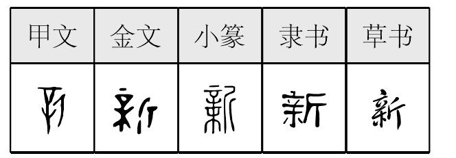 ❹ 白头如新|白首如新|除旧布新|辞旧迎新|涤故更新|涤秽布新|斗巧争新|耳目一新|翻陈出新|改过自新|革故鼎新|革旧鼎新|花样翻新|焕然一新|悔过自新|悔罪自新|竞异标新|面貌一新|面目一新|破旧立新|气象一新|弃过图新|弃旧图新|弃旧迎新|去故纳新|日异月新|舍旧图新|送故迎新|吐故纳新|推陈出新|万象更新|温故知新|咸与维新|厌故喜新|妆点一新|装点一新 新新,甲骨文作    ,金文作  (摹本),小篆作 。 “新” 即古 “薪” 字,其初文當是甲骨文第三字形左側之所从,也就是第五字形从辛从木的合體。从辛从木表示以辛 (砍伐器具)伐木,正是柴薪之義,辛亦聲。而第三、五字形中的 “斤”是累增的意符,與从辛同義。依此,則甲骨文第一、二字形皆爲第三、五字形的簡寫,第四字形从戈,“戈” 也是叠加意符,與从斤表意相同。金文基本字形沿襲甲骨文第三字形,第三字形沿襲甲骨文第五字形,衹是 “木” 和 “辛” 改成上下结構。“新” 的本義是柴薪,文獻多假借爲新舊之 “新”,後世造 “薪” 字表示本義。卜辭、銘文或表示新舊之 “新”。銘文或指刑徒,因用刑徒爲宗廟采薪而得名曰 “新”。或作人名。 楚簡帛文作   ,沿襲古體。秦簡牘文作 ,古隸典型。 224.趣談“新”字新,剛剛出現的事物叫“新”,與“老”和“舊”相對,如新衣服、新娘子。這是一個形容詞,也難以用象形表達,於是祗好借用。新,從析辛聲。析,用斧砍木,古人上山伐木,就是當柴火燒鍋煮飯。今邊遠山區仍然如此。很顯然,新是“薪”本字。