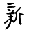 新xīn〖副词〗 表示动作行为或情况发生、出现不久。可译为“刚”、“刚刚”(9)。《触詟说赵太后》:赵太后新用事。——赵太后刚刚开始执政。《屈原列传》:新沐者必弹冠。——刚洗过头的人一定要弹一弹帽子。《吊古战场文》:都尉新降。——都尉刚投降。 新xīn❶ 砍伐树木。马王堆汉墓帛书《称》:“百姓斩木艾~而各取富焉。”(艾:通“乂yì”,割,砍。) ❷ 刚出现的,与“旧”相对。《韩非子·五蠹》:“然则今有美尧舜鲧禹汤武之道于当今之世者,必为~圣笑矣。”杜甫《兵车行》:“~鬼烦冤旧鬼哭,天阴雨湿声啾啾。” ❸ 新鲜。《论语·阳货》:“旧谷既没,~谷既升。”王维《送元二使安西》:“渭城朝雨裛轻尘,客舍青青柳色~。” ❹ 指新的人或事物。《论语·为政》:“温故而知~,可以为师矣。”韩愈《原毁》:“究其旧,不图其~。” ❺ 刚刚,新近。《屈原列传》:“~沐者必弹冠,~浴者必振衣。”杜甫《石壕吏》:“一男附书至,二男~战死。” 新*xinD0C2 ❶初出现的或出现不久的:~苗/~鲜/~品种/~生事物。 ❷刚开始使用不久或从未使用过的:~鞋/~居。 ❸刚刚;初始:~上任/你是~来的吧? ❹姓。 新 新新(纯~) 变新:更新 翻新 创新 复新 见新一新(焕然~) 如新的一样:如新(修旧~) 某一时期最新的:时新(~款式) 非常新:极新 崭新 簇新(全身~) 全新 逼新 新崭(新崭崭) 簇簇新簇崭新 新簇簇