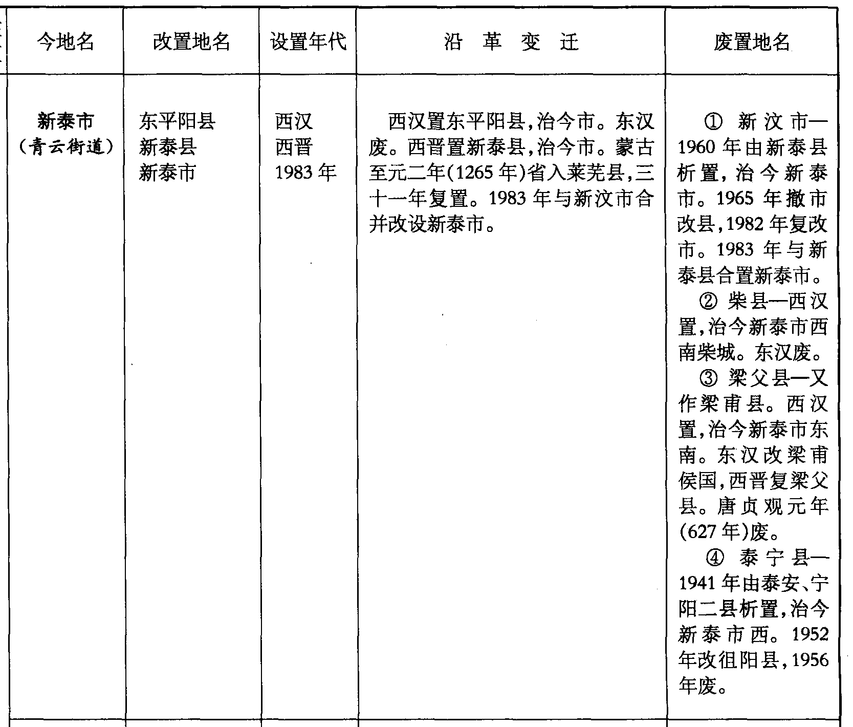西汉置东平阳县,治今市。东汉废。西晋置新泰县,治今市。蒙古至元二年(1265年)省入莱芜县,三十一年复置。1983年与新汶市合并改设新泰市。