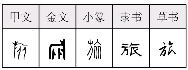 ❹ 班师振旅|飘泊羁旅 旅旅,甲骨文作 ,金文作    ,《説文》古文作 ,小篆作 。 甲骨文从㫃(yǎn),“㫃”當即 “旂”的初文。“㫃”下从一“人”或二 “人”。金文 “㫃”下或从三 “人”,或从二 “人”,或从一 “人”,或省 “人”。或增 “車”“辵”“廾”等爲意符,“車”表示車馬,其餘表示行爲動作。合體會意,表示衆人聚於旗下。本義是軍旅,引申爲衆多、陳列、次序、寄居等義。卜辭多用作本義。或用爲祭名,解者或説通 “魯”。又或用作地名。銘文或用本義。或指道路, 即 “塗”。或通 “玈”或 “盧”,表示黑色。或借指彝器,泛稱。 楚簡帛文作 ,沿襲古體。秦簡牘文作 ,古隸典型。參見437.遊字條。 旅lǚ(10画)