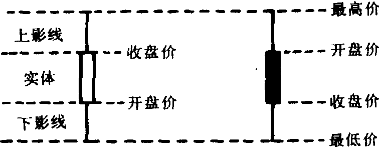 ❶开盘价与收盘价之间用粗线表示,称为实体;
