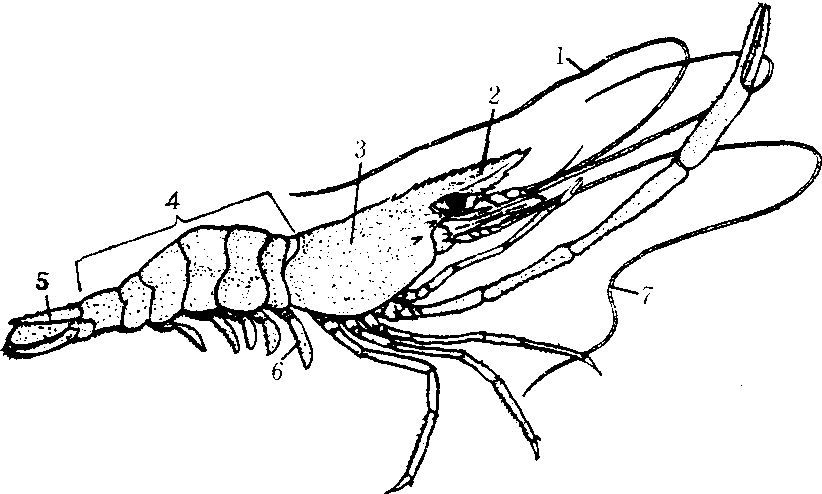 1.触角;2.额剑;3.头胸甲;4.腹部;5.尾节;6.游泳足;7.触角;