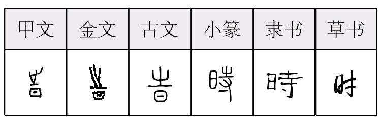 【提示】日中间的横,宋体与左右两边相接,楷体与左边相接,与右边相离。 *时(時)〔旹〕shí7画 日部 (1) 季节: 四~|农~|应(yìng)~。 (2) 时间;时候: ~空|历~|旧~|按~。 (3) 时辰,旧时计时单位,一个时辰相当于现在的两个小时: 子~|午~。 (4) 小时,法定计时单位,一小时等于一昼夜的二十四分之一: ~速|早八~。 (5) 当前;眼下: ~下|~鲜。 (6) 时俗;时尚: ~装|入~|过~|背~。 (7) 时机: 失~|~不我待。 (8) 常常;经常: ~~|~有所闻|学而~习之。 (9) 叠用,相当于“有时……有时……”: ~断~续|~高~低。 (10) 一种语法范畴,表示动作发生的时间: 现在~|过去~|将来~。 时時峕shí春秋初期石鼓文作時。从日,寺声。音变如寺侍恃峙例。小篆隶楷同。时间义。即指一切物质不断变化或发展所经历的过程。战国金文和《说文》所载战国文字作峕,从日从之,之亦声。本来寺也从之声。之就是“这个”义。隶楷也有这样写的,现作异体字。见《异体字表》。西汉草书写法近时。它是把寺的上部省略,寸上拉长。后来楷化作时,现作规范字。见《总表》。引申作时间的一段。如:古时|唐时|四时|子时|午时。又指小时,时刻。如:8时上班。又指时候。如:平时。引申为时机。如:待时而动。又指现在的,当时的。如:时事。又指时常,常常。如:时时发生困难。 时時★繁◎常★常◎异