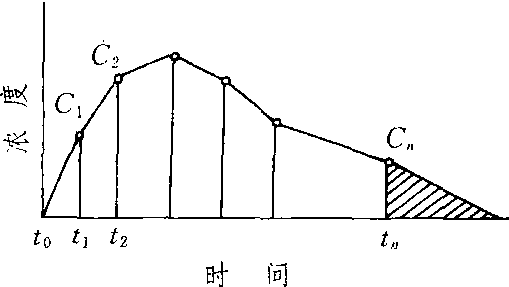 药物代谢动力学参数。血药浓度数据对时间作图所得曲线下面积。表示药物进入血循环后,从零时起至所有原形药物全部排尽为止的血浆内药物数量。用梯形法则计算。用于测定生物利用度等药动学参数。