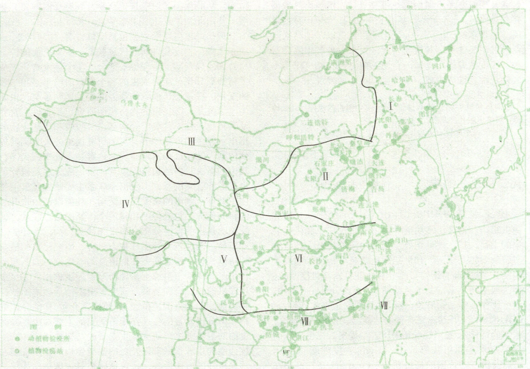 1. 古北区; 2. 新北区; 3. 东洋区; 4. 非洲区; 5. 新热带区; 6. 大洋洲区 新北区 包括北美大陆,北自阿拉斯加,南达墨西哥的北回归线,还包括东北方的一些岛屿如格陵兰,但不包括夏威夷。在气候上,这一区与古北区相似,昆虫种类组成也有若干相似之处,有时合称全北区。周期蝉是北美昆虫中最特出的一个类群,共有6种,其中3种需13年才能成熟,另3种则需17年,但由于种群个体差异,表现地区或年度间成虫出现期参差不齐,有的地区几乎每年出现。本区Gryllus属的蟋蟀发现7种,与古北区的普通大田蟋有亲缘关系,形态也极近似,但能根据不同的生物学特性区别,有些种类以成虫,有些则以卵态越冬,二者地理分布也不相同。新北区和古北区的蛾蝶类同样有较密切的亲缘关系,但相同的种类不多。 东洋区 位于热带,亚热带地区,包括中国中、南部、热带亚洲、斯里兰卡,菲律宾以及某些毗邻的小岛,东达帝汶的西里伯斯和小巽他群岛,南与大洋洲区隔海相邻。喜马拉雅山脉及其东、西部延伸部分,在古北区和东洋区之间形成一条天然分界线。大桕蛾是本地区代表种,体形大,翅展近33厘米; 大蜜蜂也是这地区的典型种,无固定蜂巢,如环境不利,即弃旧巢而他迁。苏门答腊、婆罗洲、爪哇等南洋诸岛与大陆间虽被海洋所隔,但还处同一大陆架上,故属同一昆虫区系。 非洲区 包括撒哈拉沙漠以南的非洲,三面环海,撒哈拉沙漠形成一条到古北区的过渡地带。有的学者把马达加斯加岛单分为古岛区系。非洲区与东洋区昆虫的亲缘关系最密切,其中有许多属,甚至某些种为共有的,然亦各有特点。采采蝇可作为本区的代表种,能传播睡眠病,颇影响热带非洲文化的发展。本区的白蚁种类和数量十分丰富,在非洲的自然生态和人类经济中起着重要的作用。非洲西部的特有种巨金龟,可能是世界上最重和最粗壮的昆虫。在非洲的纳米比亚沙漠,发现不少稀奇古怪的甲虫,其中伪步甲就达200种以上,多数在世界其他地方尚未发现; 蝶类中的斑蝶科绝大多数已知种都为非洲区所特有。 新热带区 北起墨西哥的北回归线,包括中美和南美,以及西印度群岛,南至玻利维亚、巴拉圭和巴西南部。昆虫类群丰富多样,且高度特化。本区蝶类具有奇异的色彩和花纹,蔚为奇观,如大翅蝶科、透翅蝶科、长翅蝶科,是这个区的特有类群,几乎整个科的种类均局限在本区。新热带雨林中的蚂蚁种类十分丰富,切叶蚁几乎只生活在本区,可将灌木树叶切成小片,然后携带回巢。还有行军蚁,为捕猎性,无固定巢穴,四处游猎。 大洋洲区 主要由大洋洲大陆,塔斯马尼亚及巴布亚新几内亚所组成。大洋洲区除南极外在中生代就被海洋与大陆的其余部分隔开。因此大洋洲区还存在着许多古老的动物类型,以及某些值得注意的活化石昆虫,如达尔文乳白蚁的某些生物学特性,还保持其近亲螳螂的祖征。古蜓科是一类原始昆虫,世界上仅知9种,其中4种产于大洋洲,一种叫 Petalura in-gentissima,可算是世界上最大的蜻蜓。蝙蝠蛾是现存最原始的蛾类之一,全世界已知约200种,本区就有近100种,也是大洋洲区的孑遗昆虫。 中国昆虫区系 中国昆虫区系是世界陆地昆虫区系的一个组成部分,分属于古北区和东洋区。两区在中国境内的分界线,西部以喜马拉雅山系及秦岭为界;东部因地势平坦,缺乏限制迁移的大屏障,南方种可向北延伸到45°N或更北,北方种可向南延伸到南岭北缘或更南。其间形成一条混合带,故对这一部分的分界线,诸家说法不一。 根据中国科学院《中国自然地理》编辑委员会(1979)对中国动物地理区划的意见,古北区在中国部分可再分为东北、华北、蒙新、青藏四区; 东洋区再分为西南、华中、华南三区(图2)。 东北区 包括41°N以北的大小兴安岭,张广才岭、老爷岭,长白山以及松花江和辽河平原的广大农、林区。气候寒温湿润。山地昆虫多为能耐高寒而以森林为生境的种类,如落叶松毛虫、落叶松鞘蛾、山楂粉蝶等。平原害虫主要属中国-喜马拉雅种类,东部与日本北海道情况相近似,北部则有许多西伯利亚成分,西南部有部分中亚细亚成分侵入。主要种类如大豆食心虫、苜蓿夜蛾、草地螟、粟叶甲、东北大黑金龟甲等。本区南部亦有少数东洋区系的广布种伸入,如稻纵卷叶螟、白背飞虱、亮绿丽金龟等。 华北区 北界东起燕山山区、张北台地、吕梁山、六盘山北部、向西止于祁连山脉东端,南抵秦岭、淮河,东临渤海,包括黄土高原、冀热山地及黄淮平原,属暖温带,冬寒夏热。本区为中国历史最悠久的农业区,分布较普遍和为害较重的农业害虫代表种有: 华北蝼蛄、东亚飞蝗、苜蓿盲蝽、沟叩头虫、黑绒金龟甲、苹小食心虫、东方粘虫、麦红吸浆虫、粟灰螟等。本区有较多东洋区种类侵入,愈近南缘,比重渐大,如苏北、皖北等地,可占1/3左右。 蒙新区 包括内蒙古高原、河西走廊、塔里木、准噶尔盆地和天山山地,在大兴安岭以西,大青山以北,由呼伦贝尔草原直到新疆西陲。东、北、西三面与苏联及蒙古人民共和国毗邻,南界则为青藏高原。气候属半干燥及干燥型,东西部差异较显著,西部多少还可受到西来湿润气候的影响,形成草原及荒漠型。在农业害虫组成上,本区东部的内蒙古、河西一带,与华北区北缘的种类较相近;牧草地上蝗虫种类甚多,亦为本区东部地带的特色,其中雏蝗属、雏膝蝗属、痂蝗属及束颈蝗属,均有一些优势种。