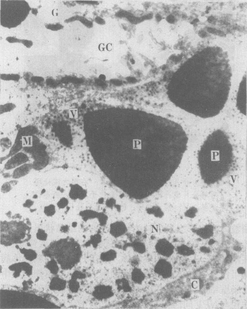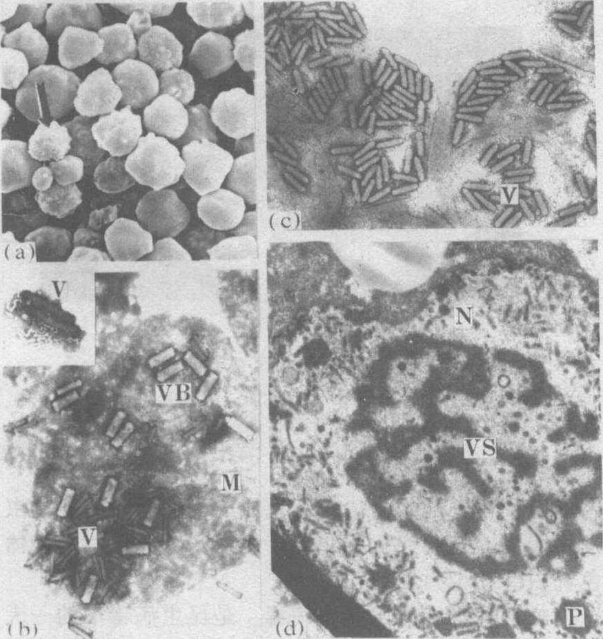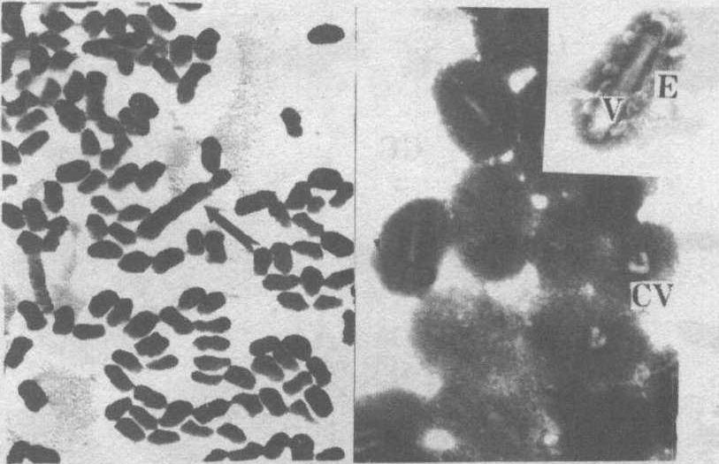 颗粒体病毒 包涵体是一个椭圓形或卵圓形的小颗粒。光学显微镜下几乎接近于分辨率的极限。通常一个颗粒体只含一个杆状病毒粒子,偶然有2个以上的。有些畸形颗粒体比正常者长几倍(左图箭头所指)。颗粒体病毒形态发生较为特殊,有的结晶状蛋白沿着核衣壳从一端往前堆积,也有从核衣壳两端延伸堆积,逐渐形成一个完整的颗粒体。属于B亚组的颗粒体病毒可侵染脂肪体细胞,体壁细胞、气管底膜细胞和中肠肠壁细胞等;可在核内或细胞质内复制增殖。感染途径与NPV同,经口和卵传染,易潜伏感染。罹病早期幼虫外观病征不明显,后期色泽变淡,腹面呈乳白色,体节肿胀,虫尸易液化,体液混浊含有大量的颗粒体病毒。发病过程较长,一般需5~25天死亡。寄主范围特异性较高,很少有不同科、属间相互感染的现象。其遗传物质是双螺旋结构的DNA,分子量较大。主要侵染鳞翅目的多种昆虫。是一种有应用前途的微生物杀虫剂; 中国研究的菜青虫GV等已获较好防治效果,国外对CV的研究和应用也有成功之例。