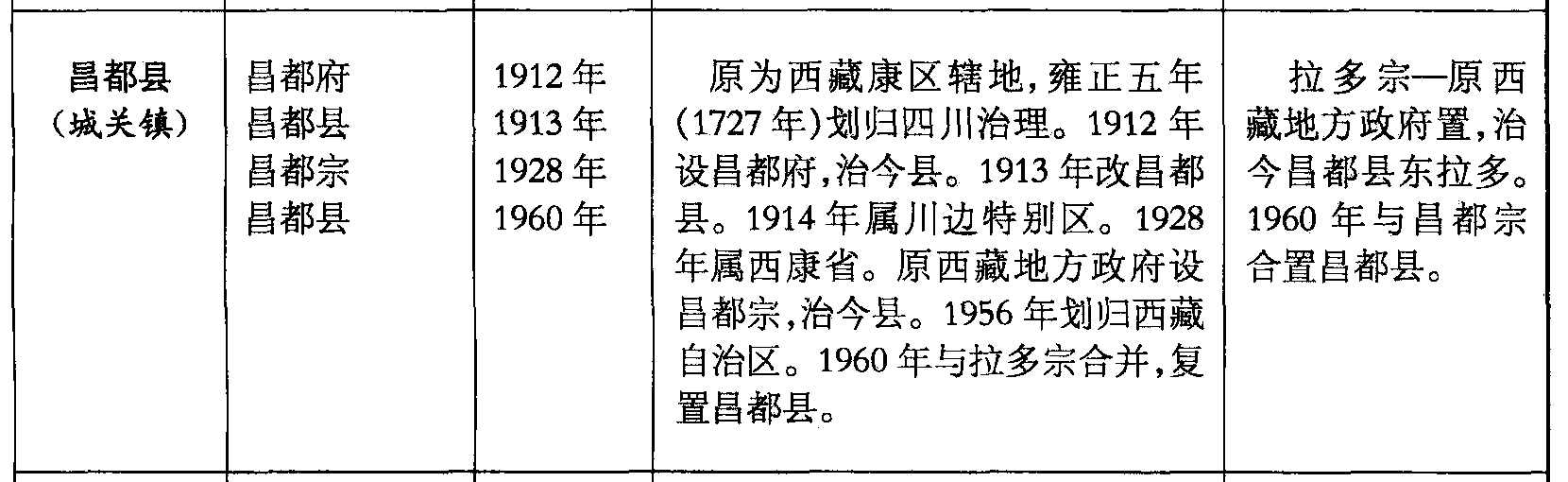昌都县(城关镇)昌都府昌都县昌都宗昌都县1912年1913年1928年1960年原为西藏康区辖地,雍正五年(1727年)划归四川治理。1912年设昌都府,治今县。1913年改昌都县。1914年属川边特别区。1928年属西康省。原西藏地方政府设昌都宗,治今县。1956年划归西藏自治区。1960年与拉多宗合并,复置昌都县。拉多宗—原西藏地方政府置,治今昌都县东拉多。1960年与昌都宗合置昌都县。