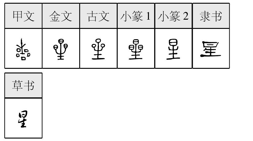 星 甲骨文; 金文; 篆xīng [象形。(《説文》:“星,萬物之精。上爲列星。從晶從生聲。一曰象形,從○,古○復注中,故與日同。”星,初文原以“晶”爲星,示意天上星星三兩相聚。象形。後借爲“光亮”,“晶瑩”字。加“生”爲返還字。楷化後簡化爲“星”,成了早期的形聲字。星,天文學上指宇宙間能發射光或反射光的天體,包括恒星〈如太陽〉、行星〈如地球〉、衛星〈如月亮〉、彗星、流星等。遠處恒星有比太陽大數萬倍的,看起來一點點,只是離我們太遠太遠。因而用以形容小的東西〈火星兒、零星雜貨〉;戥子上標示重量的記號〈定盤星〉;有突出才能的人〈歌星、影星〉。)] 《詩經·鄘風·定之方中》:“星言夙駕,説于桑田。”(星夜好天早駕車,約定停車桑田邊。) [春秋] 左丘明《左傳·襄公九年》:“晉侯曰:‘十二年矣,是謂一終,一星終也。’”(楊伯峻注:星指木星。古謂之歲星。古人劃周天爲十二次,以爲木星一年行一次,十二年滿一周天,故十二年爲一星終,而用之紀年。實則木星繞周天,即公轉周期,僅十一又百分之八六年。) [西漢] 司馬遷 《史記·秦始皇本紀》:“有墜星下東郡,至地爲石,黔首或刻其石曰‘始皇帝死而地分’”。(有一顆流星從東郡的上空落下,到地變成石頭,老百姓在石上刻字道:“始皇帝死而土地分”。) [宋] 秦觀《鵲橋仙》:“纖雲弄巧,飛星傳恨,銀漢迢迢暗度。”