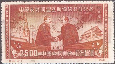 | 释义 | 中苏友好同盟互助条约签订纪念(东北贴用) 发行日期:1950年12月1日 齿孔度数:14 印刷版别:雕刻版 图幅:50.5×28 全张枚数:50(5×10) 原画作者:王式廓 设计者:孙传哲 雕刻者:刘国桐 币制:东北币 印刷:北京中国人民印刷厂