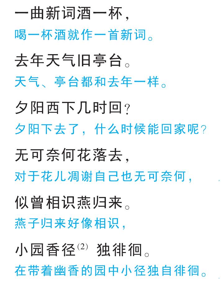 一曲新词酒一杯, 去年天气旧亭台。 夕阳西下几时回? 无可奈何花落去, 似曾相识燕归来。 小园香径(2)独徘徊。