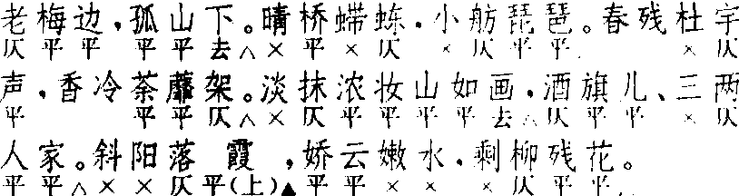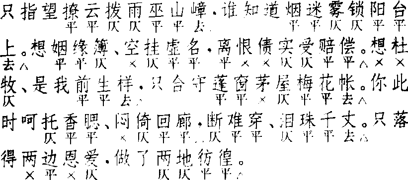 | 释义 | 普天乐 普天乐张可久 小令 ![]() 全曲十一句:3,3△。4,4△。3,3△。7△,7△。4▲,4,4△。第五、六句本三字句,张可久多作五字句。全曲除第七、八两句因句式不同,不能作对外,其他各句均可作对。末三句对式,有前两句对者,如鲜于必仁“西风渡头,斜阳岸口,不尽诗愁”;有后两句对者,如张可久“寻村问酒,无人倚楼,有树维舟”;有 三句鼎足对者,如张可久“朱颜易老,青山自好,白发难饶”。叶韵变化亦在前两句。前两句有以仄叶者,如张可久“凉生院宇,人间洞府,客至蓬壶”;有以平叶者,如张可久“今宵月明,声沉玉笙,影淡银灯”;有一叶一不叶者,如张可久“阑干晚风,菱歌上下,渔火西东”。细分之可列出多种格式。亦有三句全不对,只末句叶韵者。小令兼用。亦入〔正宫〕,名〔黄梅雨〕。与南曲不同。 ☚ 满庭芳 上小楼 ☛ 普天乐 普天乐徐复祚 《红梨记》 ![]() 全曲十句:7△,7△。7,6△。6△,7△。7△,7△。4,4△。 其二 王玉峰 《焚香记》 ![]() 全曲十句:6△,6△。7,6△。6△,7△。7,7△。4,4△。 其三 梁辰鱼 《浣纱记》 ![]() 全曲八句:6△,6△,10△,7△。4△,5△。4,4△。 其四 张凤翼《红拂记》 ![]() 全曲六句:6△,6△。10△,7△。4△,9△。此曲词式有四,以第一式为主,其他三式都是第一式的变体。第一式始见于《琵琶记·义仓赈济》,其后《西厢记·乘夜逾垣》、《绣襦记·堕计消魂》、《义侠记·解梦》等用之。第二式首二句改为六字折腰句,馀同第一式,早期作品有《拜月亭·彼此亲依》、《杀狗记·看书苦谏》。《张协状元》第九出一支与此相近。第三式首四句及末二句与第二式同,中间却简化为二句。第四式又减去第三式的第六句五字句。末二句合为上三下六式九字句者,尚见于其他作品,如《义侠记·解梦》“向娘行、试将疑虑先讯”,《昙花记·魔难不屈》“单保得、这灵台一点无尘”,《玉合记·怀仙》“从今把多情付与东风”,《水浒记·召衅》“忆交情、使人梦役魂劳”等。因为末二句四字二句上加一领句字,如所引第二式,甚为普遍,亦为九字;此两种句式,语法组织虽不同,而音节组织固仍不变也。第三、四式的第三句上三字可不叠;第三式第五句前的“呀”字亦可不用。此曲用法亦有四:第一式多单用一支,有叠用三支的一例;亦有用作套数首牌者。第二式多用为套数首牌,后联〔雁过声〕、〔倾杯序〕、〔玉芙蓉〕、〔小桃红〕成套;亦可单用。第三式用于南北合套,与北〔朝天子〕循环使用(北〔朝天子〕已经昆化,与元人北曲不同)。第四式用于〔锦缠道〕套内;并可作小令用。《南词简谱》称第二式为“前腔换头”,但此曲第一、二两式并不同时并用,“前腔”二字即无着落;又称第三式为“大普天乐”,第四式为“小普天乐”,此仅就二式而言,如统四式论之,则“大”、“小”又不恰切矣。故今不用《简谱》所称,而标以数字,他曲之有数式者,亦皆如此处理。与北〔中吕〕不同。以〔普天乐〕为主的集曲有〔普天芙蓉〕、〔乐颜回〕、〔天边雁〕、〔普门大士〕、〔普天两红灯〕、〔普天红〕,见《南词简谱》。 ☚ 锦缠道 雁过声 ☛ 普天乐 普天乐曲牌名。南北曲均有。北曲属中吕宫。南曲属正宫,一名〔四块玉〕。据清·周祥钰《九宫大成谱》,属北曲中吕宫者,字数定格及韵式作三、三、四、四、三、三、七、七、四、四、四(十一句) 。可用作小令,亦可用 于套曲中。属南曲正宫者有二体。其一通称为 〔大普天乐〕,字数定格及韵式作六、七、七、七、六、七、七、七、三、六(十句)。其一或为 〔朝天子〕 合套格,无单用者;或与 〔锦绵道〕、〔古轮台〕 合套,亦可单用。名为 〔小普天乐〕。 ☚ 红绣鞋 醉高歌 ☛ 普天乐 普天乐❶唢呐曲。流行于聊城地区。常用于农村的喜庆场合。全曲分两段:第一段以优美抒情的歌唱性旋律和活泼欢快的跳动性旋律形成对比变化,主要运用了“弹舌音”、“三弦音”、“箫音”等特有技巧;第二段是流畅的快板,即乐曲的高潮。全曲热情奔放,风格淳朴,别具风味。 ☚ 曾衍东 寒林平野图 ☛ |