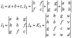 的秩是1时,K1是移轴下的不变量;秩是2时,K2是移轴下的不变量.I1,I2,I3和I4叫做普遍二次曲面F (x,y,z)=0的基本不变量,K1和K2叫做条件不变量或半不变量.这六个不变量组成普遍二次曲面不变量的完全系统.利用它们可以完全确定曲面的形状,但不能确定曲面的位置.普遍二次曲面F (x,y,z)=0所表示的轨迹可用I1,I2,I3,I4,=K3及K1,K2判别如下表: