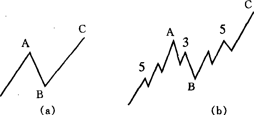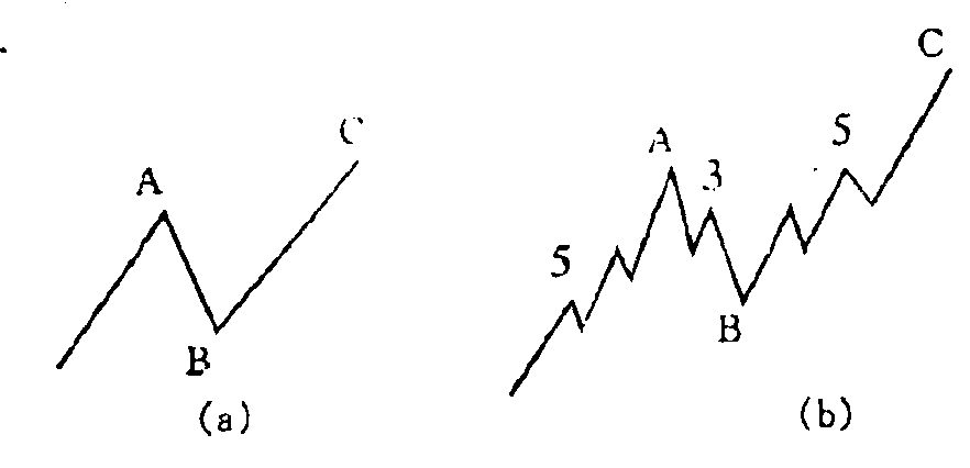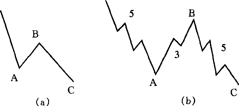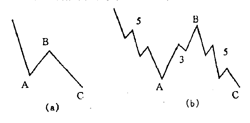 亦称“锯齿型调整浪”。多头市场里的曲折型调整浪。它是一个简单的3浪下降走势,以A-B-C标记,可细分为一个5-3-5的形式,其中 B浪的波峰明显地低于A浪的始点水准。如图10-8所示。