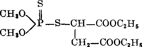 图1 杀螟硫磷 马拉硫磷(马拉松、4049) 高效、低毒、谱广,具有触杀、胃毒、熏蒸等作用,可用于蔬菜、花果、烟草、树木和粮谷的贮藏。化学名:O,O-二甲基-S-(1,2-二乙氧基酰基乙基)二硫代磷酸酯,分子式(CH3O)2P(S)SCH(CH2COOC2H5)COOC2H5,结构式见图2,分子量330.40,纯品为淡黄色油状液体,具有强烈的大蒜臭味。工业品深褐色油状液体。微溶于水,可溶于多种有机溶剂,遇碱、酸或金属物质易分解失效。马拉硫磷对哺乳动物的毒性较低,经口LD50(mg/kg体重)小鼠:雄性1190.7,雌性1581.6;大鼠: 雌性1751.5,雄性1634.5。在受孕大鼠中未出现胚胎毒性和致畸胎作用。我国建议粮食中马拉硫磷最高允许残留量为8mg/kg。世界卫生组织规定ADI为0.02,各类食品的允许残留限量(mg/kg):面粉2,柑桔类4,樱桃、李、梅6,卷心菜5,蕃茄3,豆类、苹果2,其他蔬菜、水果0.5,马铃薯、芹菜1。