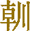 *朝zhāo12画 部 (1) 早晨: ~阳|~霞|~夕|~思暮想。 (2) 日;天: 今~|一~有事。 另见cháo(46页)。 朝 ☚ 倝部 㫃部 ☛ 朝1.zhāo 2.cháo1.zhāo 甲骨文象日和月在草或木中。象太阳在早晨刚升起时,还在地平线上草木中,月亮还没消失。小篆日字上下讹变,右旁从“舟”声。都误。是早晨义。如:朝夕|(学校)朝会。组词如:朝气。引申有日、天义。如:今朝。小篆日字旁上下讹变,右旁从舟,《说文》舟声,都误。 2.cháo 金文不从月旁,从水旁。这也是潮水的潮的本字。古书即用朝为潮。如:江汉朝宗于海。可能古人也知潮水涨落与日月的引力有关。引申有朝向义;向着,对着。如:坐北朝南|朝前走。引申为封建社会官员见皇帝。如:朝见|朝拜|朝圣(指宗教)。又引申为朝见之地。如:朝廷|上朝|早朝。又用于一姓皇帝传若干代统治的时代。称为朝代。如:唐朝|改朝换代。 朝★常◎常