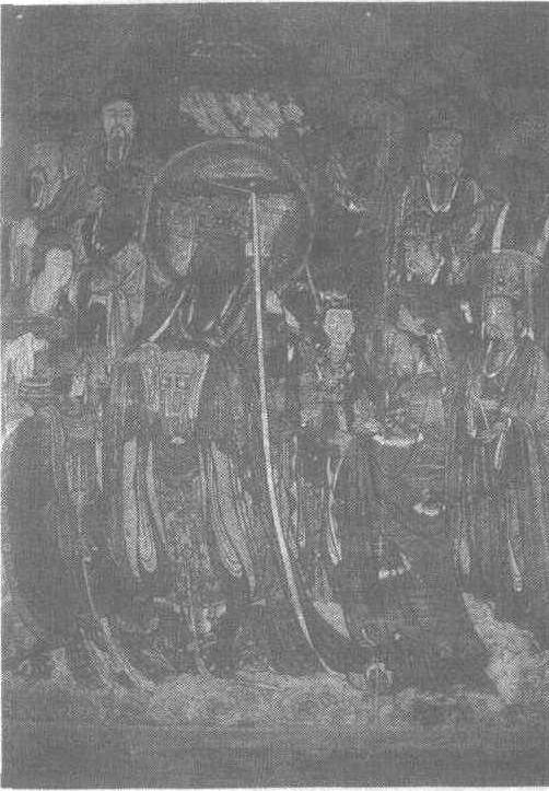 元。纵433厘米,横345厘米。山西省芮城县永乐宫三清殿东扇面墙外侧壁画。此图共有14尊画像,南极长生大帝居画面的主要位置,其身旁立玉女及玄元十子。南极长生大帝一副帝王装束,头戴冕旒,身着宽大华丽的帝服,脚蹬云头鞋,身材魁伟,巍然而立。面貌庄严,垂胸的长须增添了几分威风,其神态似在倾听臣属奏事。右前方一玉女背向画面,双手捧钵,侧身回首仰视长生大帝。玉女身材窈窕,体态轻盈,宽松的长裙具有流线形线条。长生大帝左后侧侍立的玉女衣饰华丽,面貌端庄,手中捧圭。长生大帝的左前方是玄元十子之一,正持经书在诉说禀报。画师技艺娴熟,人物性格和神态受现实启发,具有写实性,但根据绘画题材又注入了一种“仙气”,使人感受到它的宗教气息。画面构图完美,人物线条流畅,衣纹线条一气呵成,足见画师的绘画功底和把握能力。