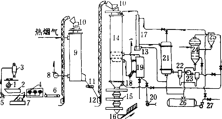 图2 内热立式干馏釜工艺流程 1.原木捆;2.料仓一给料器;3.锯屑旋风分离器;4.断材机;5.风机;6.传送带;7.劈柴斧;8.烟道气风机;9.干燥器;10.水封;11.传送带;12.斗式提升机;13.焦油水封;14.干馏釜;15.闸板阀;16.木炭提升机;17.前冷凝器;18.吸风机;19.燃烧一混合室;20.鼓风机;21.冷凝-冷却器;22.雾滴捕集器;23.风机;24.泡沫吸收器;25.旋风分离器;26.木醋液收集器;27.泵 干馏釜的操作是半连续式的,每隔15~30分钟卸料和加料一次。加料器采用双重闸板结构,使加料时釜内的蒸汽气体不致外逸,避免干馏产物的损失。经干燥的原料从顶部加入干馏釜,自上而下经干燥区进一步蒸发水分。在炭化区用循环载热体加热炭化;在煅烧区煅烧木炭,继续分出挥发物质,使木炭的固定碳含量达到指标要求。在木炭冷却区用冷木煤气冷却木炭,使温度降低到40~60℃,然后经卸炭器卸出。卸炭器由3个阀门组成: 第一个是针形阀,用来隔断炭层;第二个是闸板阀;第三个是翻板阀。卸炭时,由上而下按顺序逐个开、关各阀门。载热体由煅烧区进入干馏釜,由下向上通过炭化区和干燥区,与木材热解的蒸汽气体产物一起从干馏釜上部出口管引出,送入前冷凝器和冷凝—冷却器分离木醋液和木焦油,再经泡沫吸收器分离甲醇等低沸点组分,冷却到20~30℃的木煤气送干馏釜下部木炭冷却区冷却木炭,并使木煤气预热,然后送入燃烧—混合室。燃烧得到的高温烟气与冷木煤气混合,得到500~600℃的载热体从第一个锥形漏斗下面送入干馏釜。在正常情况下,当木材含水率在15%以下时,利用木煤气燃烧的热量可保证干馏釜热量自身循环。 干馏产物与用途 经过干馏得到的热解产物有木炭、木醋液、木焦油、木煤气、木沥青等。阔叶树材和针叶树材干馏时得到的主要产品见表。木炭大多作商品,或再加工成活性炭。木煤气直接作干馏用的补充燃料。在正常运转中,不需补充其他燃料。木材干馏产物产率(重量%)表 | 树种 产物 | 白桦 | 山毛榉 | 松树 | 木 炭 二氧化碳 一氧化碳 甲 烷 不饱和碳氢化合物 醋 酸 甲 醇 丙 酮 乙酸甲酯 木焦油 可溶性焦油和其他有机物 水 分 | 31.80 9.96 3.32 0.54 0.19 7.08 1.60 0.19 0.02 7.93 8.15 27.81 | 34.97 10. 90 4.22 0.47 0.20 6.04 2.07 0.20 0.03 8.11 5.89 26.58 | 37.83 10.13 3. 74 0.59 0.23 3.50 0.88 0.18 0.01 11.79 8.03 22.27 |