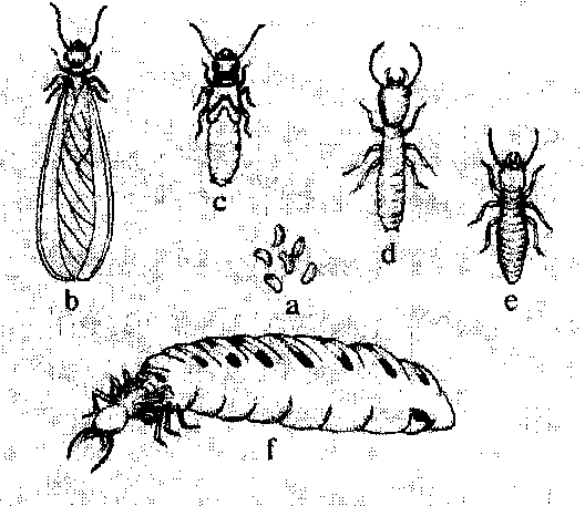 图2 褐粉蠹 白蚁也是危害木材的昆虫,它多分布在热带和亚热带地区,全世界约有2 000多种,中国已发现有100余种,严重危害木材的约10余种。白蚁是群居社会性昆虫,个体分化为生殖蚁、兵蚁和工蚁,危害木材的是约占群体90%的工蚁,以啮食木纤维破坏木材,消化纤维的是在它肠囊中共生的原生动物和细菌,这些微生物能分解纤维素和半纤维素成葡萄糖,并再经嫌气发酵,分解为醋酸、氢、二氧化碳和能量。白蚁啮食木材有两种形式,一种是钻蛀木材内部筑蚁道和蚁巢,多啮食软材部分,将木材破坏成层片状而表层完整;另一种是啮食全部木材,木材呈碎片状。白蚁按其生活习性可分土栖、土木栖和木栖3个类型。土栖白蚁专门危害湿木材,木栖白蚁则危害干木材居多。在中国危害木材严重的白蚁主要为鼻白蚁科的家白蚁(图3)、散白蚁(黑胸散白蚁和黄胸散白蚁等)和土栖的大白蚁(黑翅大白蚁等)以及危害干木材的堆沙白蚁、铲头堆砂白蚁等。