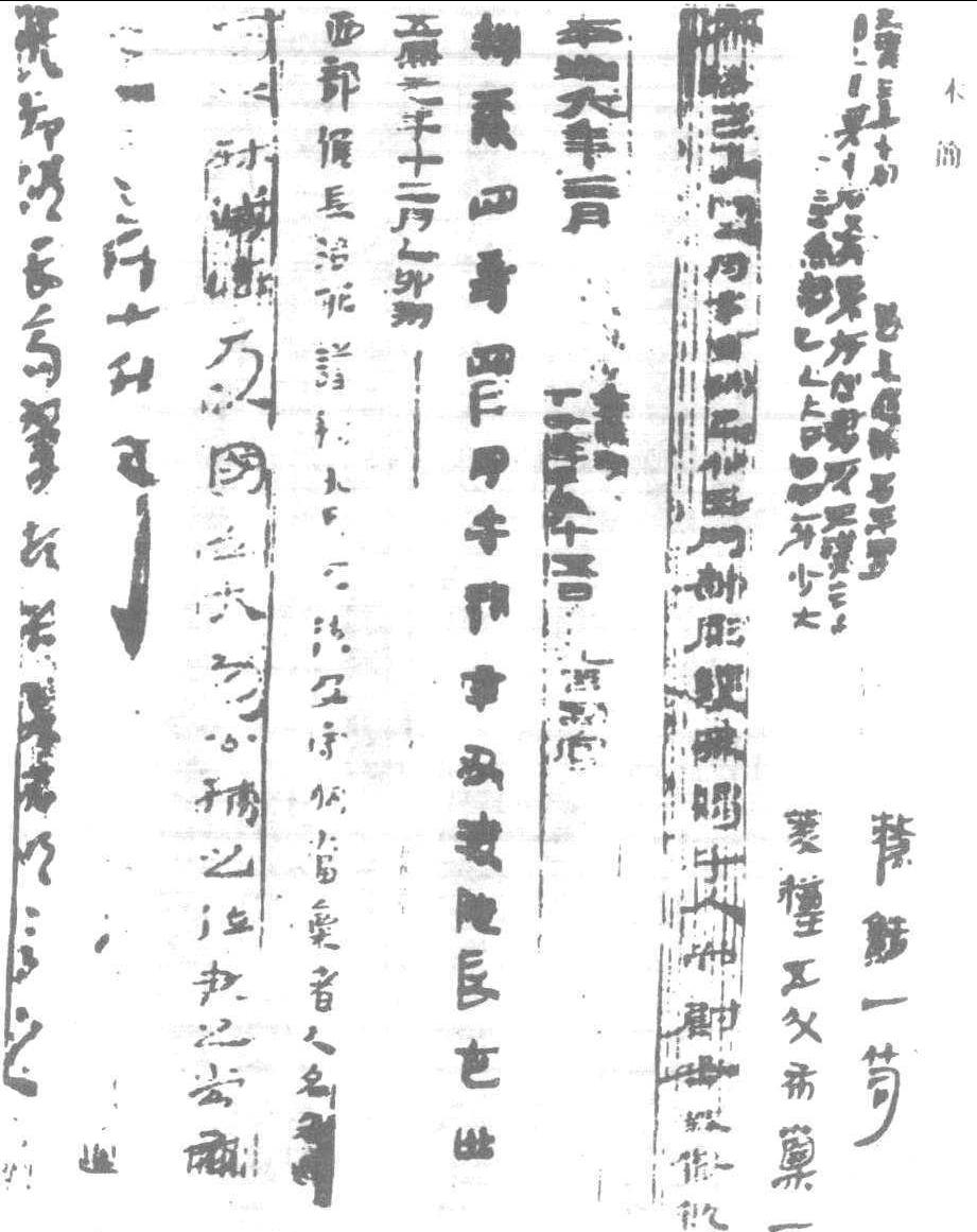 木簡 并竊走晉代木簡一百二十一片,此蓋木簡發見之嚆矢。1900年至1901年,馬克·奥里爾·斯坦因 (1862—1943英國考古學者,原籍匈牙利)受英國印度殖民政府顧聘,非法入華西部,探測古于闐(古西域國名,又作于寘在今新疆和田一帶) 之遺迹,於和闐(和田縣)、克里雅、尼亞等地,訪得并盗走晉代簡牘累累。1907年斯坦因又深入甘肅西部,考察古長城遺迹,盗劫兩漢及晉代木簡數百片。日本西本願寺探險隊三度赴中國西部考察,第二次(1908—1909)搜集大量木簡,舶載日本。此係初期木簡發掘物。1930年以後,陸續出土甚豐,多達數萬計。其大略參見附表: 〈木簡之形態〉 普通木簡長23公分,寬1公分,厚0.2至0. 3公分。竹簡之字書於裏面,而木簡兩面寫。一方簡約書三十至四十字,若連寫兩簡以上,則將簡以紐相繫。紐多為麻繩,上等紐用素絲綸或青絲綸,偶用革條。常縛成兩道,故有象形字“册”。簡書多以甲骨文或金文,殊顯古雅。“典” 字意即置册于臺上。 所書木簡之文,若屬保密尺牘或紀要文書,則卷成一捆,其上置蓋 (稱為 “檢”),以繩縛實,繩上涂泥,鈐押封印,此即 “封泥”。繩繫結頭大都埋藏於里處,以使木簡在移動或送遞過程中,封泥不致破損。 “觚”亦為木簡之一種。一般木簡不過表裏里兩面書,若製成三角柱、四角柱或六角柱,則可三面、四面、六面書,此即所謂 “觚”。 〈木簡之内容〉 名目繁多,有法律、書籍、遺策、文書、詔書、通行證、發貨證、帳簿等。 (1)法律——秦漢時木簡出土略表之法文,除少數尚載於史籍、文獻外,大都已散佚。而“雲夢秦簡”中,與秦律相關者達六百枚,洵為秦律研究之必需。 (2)書籍—— “武威漢簡”中,書寫《儀禮》者有四百六十九枚,計二萬七千三百三十二字。“臨沂漢簡” 中有書 《孫子》、《六韜》、《管子》、《墨子》 等。“長沙漢簡” 中良多醫學書。 (3) 遺策——埋入墳墓之殉葬品目録。楚簡多此類。 (4) 文書——多與軍務暨邊境行政相關,見於 “江陵漢簡”等。 (5)詔書——見於“敦煌漢簡”及“居延漢簡”。 (6)帳簿——見於 “居延漢簡” 及 “敦煌漢簡”,為官廳暨軍事帳簿。其它尚有通行證、發貨證、符節等。