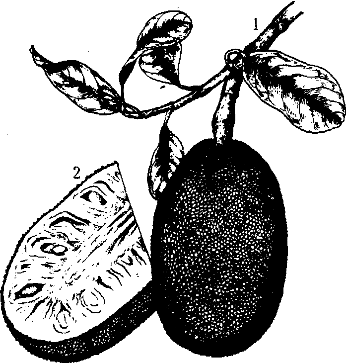 木 菠 萝1. 果枝; 2. 果实纵剖面 木菠萝喜高温多湿的低地环境, 多种在海拔高度600米以下的低地。年平均气温≥21℃, 最冷月平均气温≥13℃,绝对最低温度>0℃, 偶有轻霜的地方仍能开花结果。对土壤要求不严, 但在过于干旱、瘦瘠或常有低温霜冻的地方生长不良。宜在高温潮湿、土壤肥沃疏松、排水良好的低丘陵地或平地栽培, 以村舍周围栽培结果最好。 主要品种 中国的木菠萝有干包和湿包两大类。干包类成熟时果皮软而韧, 果皮的乳突一般较平, 假种皮肉质, 爽脆, 风味好; 湿包类的果皮乳突一般较尖,成熟时果皮不韧, 易破, 假种皮近浆质,粘糊。由于长期用种子繁殖, 不同植株间在果实大小、形状、假种皮薄厚、风味和叶片大小等均有较大差异。一般春季开花, 每年结果一次, 也有四季开花结果的。中国很少成片栽培, 还无定型的品种。 栽培技术要点 可用种子、圈枝或嫁接(补片芽接)法繁殖。因用种子播出的幼苗须根少,移植难成活,多为直播, 或用容器育苗, 带土定植。木菠萝种子不耐贮, 宜采后即播。选果实中段的顶尖基部圆之种子播种较好。8~11个月龄的小木菠萝作砧木最好。定植行株距8~12米。肥水足, 植株生长迅速。一般植后3~8年开花结果。农户常用刀砍树干, 促进开花结果。如结果过多过密, 应行疏果。成熟果不耐贮运。 经济价值 木菠萝果肉含糖15%以上, 还含有丰富的蛋白质和维生素A。可鲜食、制果汁、果酱或蜜饯, 也可酿酒。种子富含淀粉, 可煮、烘、炒或炸后食用, 味美如栗; 和瘦肉煮食, 可治疗妇女产后乳汁缺乏症。未成熟的果实可作菜肴。有些国家作粮食。其木材干后不变形,橙黄色, 纹理美观, 可制高级家具。木菠萝树形美观, 生长快, 又是良好的绿化树种, 宜在热带和温暖亚热带地区发展。 木菠萝jackfruitArtocarpus heterophyllus Lam.,又称菠萝蜜、树菠萝。桑科,木菠萝属。常绿乔木。2n=56。原产印度至马来西亚一带。热带地区广泛栽培,中国广东、海南、福建、云南等省有引种。树高约20 m,树冠圆头形。叶革质,长椭圆形至倒卵形,全缘。2~3月开花,雌雄同株,单性,花小;雄花序顶生或腋生,圆柱形或棒状;雌花序圆柱形或长圆形,生于树干和枝干上。果实为聚花果,单果重2~3 kg,大的可达20 kg,果皮有细密的瘤状突起,黄褐色;果肉层叠如橘瓤,肉质柔软,味甜美,有浓香。每果种子100~500粒。9~10月成熟。性喜温湿。实生及扦插、分株繁殖。果肉供鲜食、菜用、制干品或盐渍。种子可煮食。树姿优美,可作观赏树。