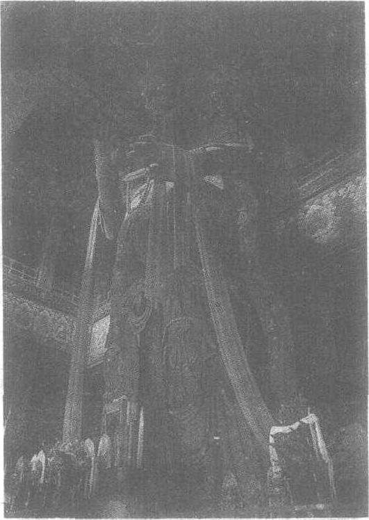 | 释义 | 木雕弥勒佛立像 木雕弥勒佛立像清。通高26米,其中地面上高度为18米,直径3米。立于北京雍和宫万福阁(亦称大佛阁)。据记载,此尊是乾隆十五年(公元1750年)西藏七世喇嘛为感谢乾隆皇帝派兵平息西藏叛乱,作为酬答的礼品,从西藏经四川运到北京的。此佛由一整根旃檀木雕刻成,佛顶冠直达天花板。万福阁即是围绕佛像建造的中空三层檐大阁。佛头戴宝冠,下着长裙,袒露的上身饰满华丽的璎珞、宝钗,并于颈上饰一大蛇,佛的左手掐住蛇头,右手捏蛇尾于胸前,端庄而立,一条如同哈达的长带顺着两只手腕垂下。该弥勒佛体躯宏伟,雕工生动,是我国木雕艺术的珍品。在阁内观其,须仰视方成,为佛像增加了几分高大感。