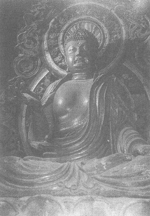 | 释义 | 木雕释迦牟尼像 木雕释迦牟尼像明代景泰年间(公元1450——1456年)。通高256厘米,座高70厘米。山西省洪洞县广胜寺(上寺)大雄宝殿藏。佛衣右袒袈裟,左手扶膝,右手曲肱抬起,结跏趺坐于莲花座上。其面容丰腴,眉间饰白毫相。背光作上、下相交的两个圆环状。其中上环中心绘红、白、黑等曲线纹。其余各处透雕卷草、荷花等纹饰,并饰红、绿、白等色彩。此尊雕像威严壮美、气势雄浑,极具艺术魅力。释迦牟尼,佛教始祖,传说他生于公元前565年,29岁时感悟人生无常,出家行道,35岁时得道于菩提树下,从此周游四方40余年,是表现形式较多的宗教人物之一。