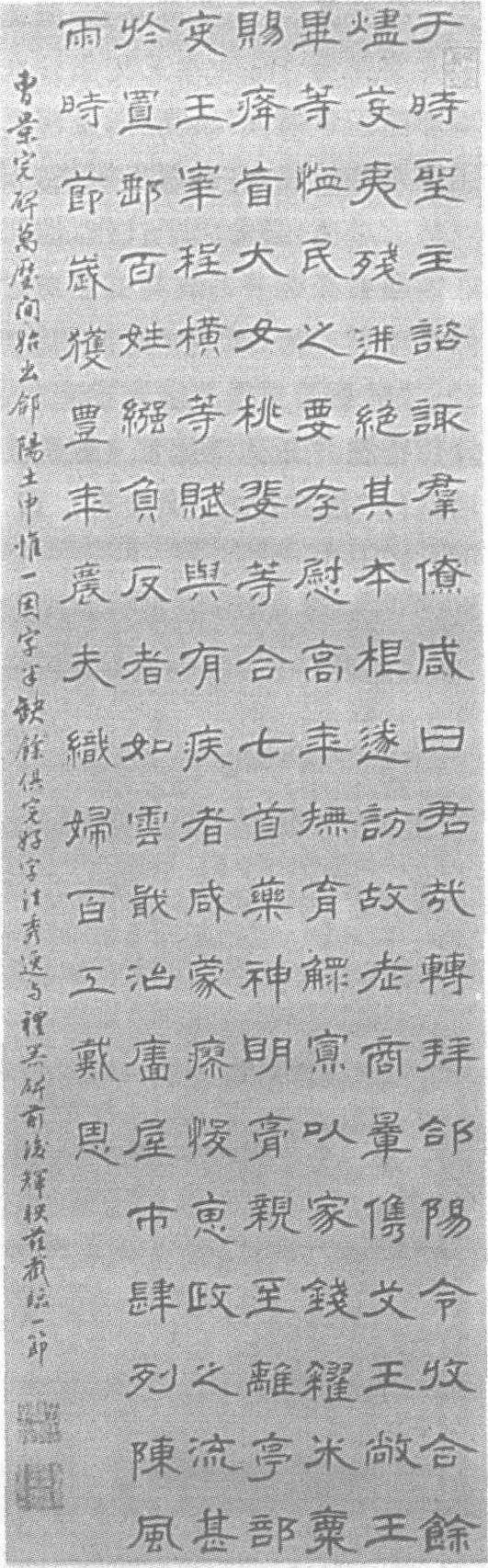 | 释义 | 朱彝尊隶书节临曹全碑 朱彝尊隶书节临曹全碑清。纸本。纵104厘米,横32.5厘米。辽宁省博物馆藏。朱彝尊(明崇祯二年—清康熙四十八年,即公元1629—1709年),字锡鬯,号竹垞、鸥枋、醧舫、金风亭长,晚号小长芦钓鱼师,浙江秀水(今嘉兴)人。年少极好古学,博览群书,南北游览,并搜寻金石。康熙十八年以布衣召试博学鸿词科,授翰林院检讨,充《明史》纂修官,体例多从其议。康熙二十二年入内廷直南书房,引疾罢职,从事著述。精于考证金石,工古文,诗与王士禛同名,并称“南北二大宗”。词与陈维崧并称“朱陈”。工画山水,善八分书,笔意秀劲,韵致超逸。清秦祖永《桐荫论画》云:“竹垞古隶笔意秀劲,韵致超逸。”清钱泳《履园丛话》云:“国初有郑谷口始学汉碑,再从朱竹垞辈讨论之,而汉隶之学复兴。”著有《曝书亭集》、《经义考》、《日下旧闻》,辑有《词综》、 《明诗综》。《清史稿》卷四百八十四有传。此朱彝尊节临《曹全碑》,书后有行书跋语记曹碑出土的时代,并评价碑文书法成就可与《礼器碑》并驾媲美。隶书深得原《曹全碑》之笔意,结体方圆兼施,字画疏朗典雅,笔力遒稳刚健,章法布局整齐。然其行隶书虽比原作逊一筹,但也不失为隶书之佳作。
