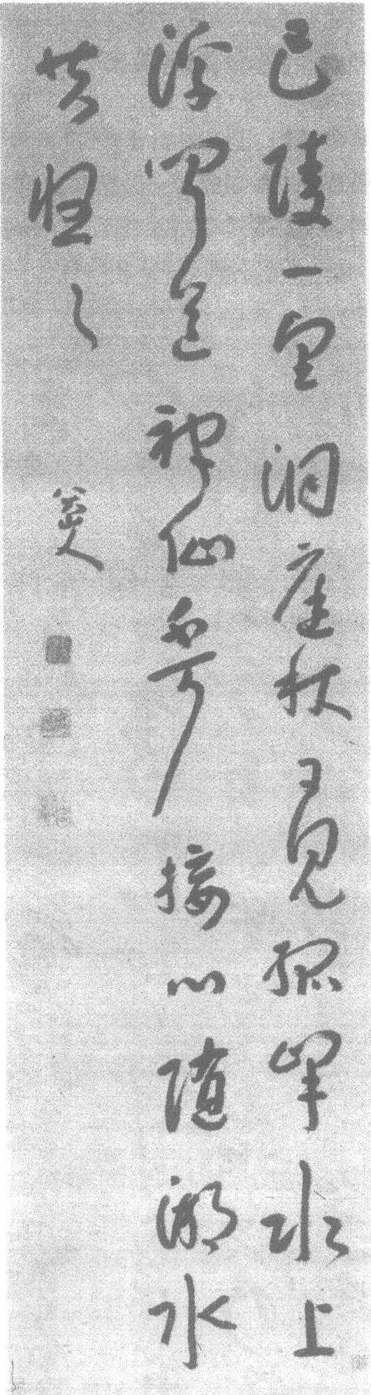 清。纸本。纵177厘米,横45.3厘米。北京故宫博物院藏。朱耷,(明天启六年—清康熙四十四年,即公元1626—1705年),明宗室后裔。号雪个,又号个山、人屋、驴屋、八大山人。江西南昌人。是清初杰出画家,“四僧”之一。书法师承二王、颜真卿和苏轼,又受王宠影响,具有朴茂沉雄的风格和秀丽灵动的韵致。在明清之交以崇尚董其昌书法为主流的书坛上创出了自己独特的面貌。此件作品行书录唐人张说诗:“巴陵一望洞庭秋,日见孤峰水上浮,闻道神仙不可接,心随湖水共悠悠。”运笔流畅,体势怪伟,刚柔相济,与其画风有相通之妙。