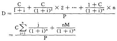 | 释义 | 久期 久期是在研究附息票债券时由Macaulay提出的概念,它比债券的到期日更为准确地刻画了债券的时间特性。 具体说来,它把附息票债券根据到期日的不同看做一系列零息票债券,根据一定的折现率,计算出每一种零息票债券的现值和债券的总现值,再计算出每一种零息票债券的现值占债券的总现值的比重,并用这一比重作为权重,对零息票债券的到期日进行加权平均,结果即为附息票债券的久期。 假定有一种附息票债券,期限为n期,每期支付利息为C,债券的折现率为i,用D表示债券的久期,P表示债券的总现值,M表示债券的面值。计算公式为: