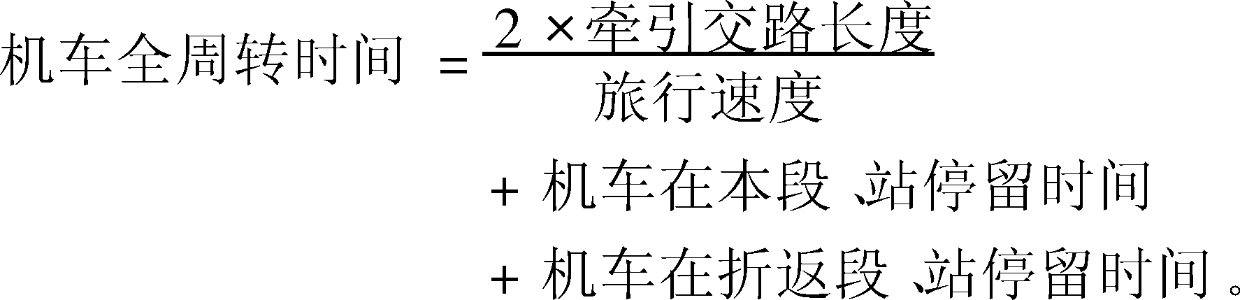 | 释义 | 机车全周转时间 机车全周转时间time of turnround of locomotive机车在交路上往返牵引一对列车所消耗的全部时间。包括机车在牵引交路上往返运行时间,在机务本段及所在站停留时间以及在折返段及所在站停留时间。其计算公式为: