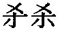 ❹ 捐残去杀|一笔抹杀|自相残杀 杀shā (甲) (篆) 繁体为“殺”。甲骨文字形,在人(大)的下方做上一个被剁的记号,表示杀。小篆左边是个长发散乱的人,右为殳(shū),殳,兵器。头的四周有几个小点,像鲜血四溅。意为用兵器把左边的人“干掉”。本义为“杀戮”。简化字“杀”可分解为“乂”(yì)与“木”,“乂”有剪除的意思,像剪去树木的顶部一样把人头割去,也有杀伐的意思。作声符生成的字有: snā 刹(刹车) 铩(铩羽而归) 𢫬(杂糅) sà 脎(一种有机化合物) chà 刹(刹那)